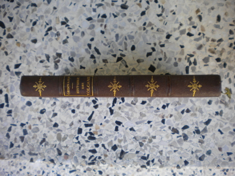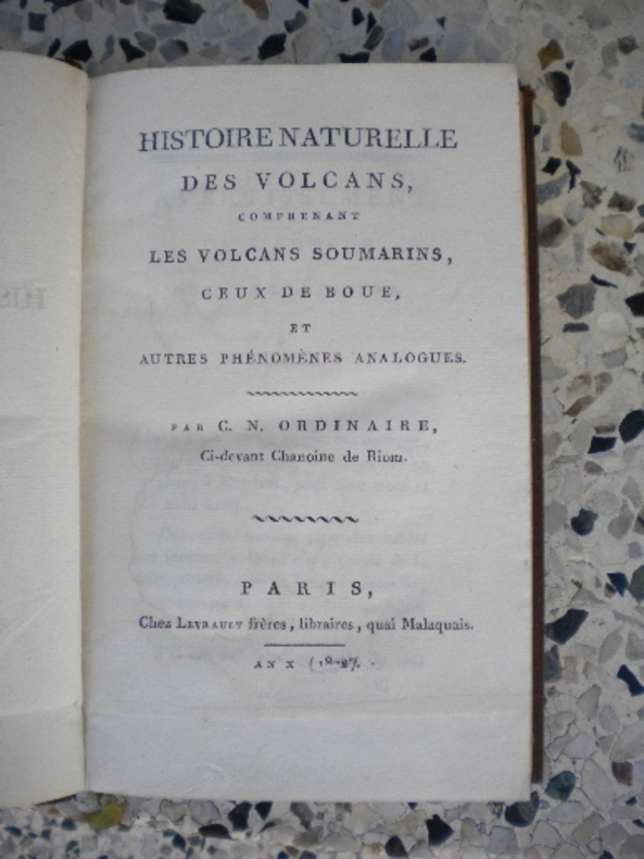 Édition originale et seule édition française. L'auteur avait publié son travail l'année précédente à Londres, en Anglais. Il a fait ici quelques additions, dressé une liste de tous les volcans en activité, et surtout établi la "mappemonde volcanique" qui manquait à l'édition anglaise. Cette carte, qui mesure 85,5 x 43,8 cm au filet, a été gravée par Tardieu. Les volcans d'Amérique Centrale y figurent en détail dans un cartouche. Théorie des volcans ; description des volcans connus. Le dernier chapitre concerne le Continent Perdu : l'Atlantide. Le naturaliste Claude-Nicolas Ordinaire fit de nombreuses excursions dans les montagnes d'Auvergne alors qu'il était chanoine de Riom. Prêtre réfractaire, il fut condamné en 1793, et partit alors à travers l'Europe avant de revenir à Clermont-Ferrand où l'attendait un poste de bibliothécaire. (Quérard VI, p. 496). - Ex-libris Bellaigue de Bugheas (XIX°s.) et ex-libris Alfred Redon, ce dernier enrichi d'une note du bibliophile clermontois. Intérieur du volume frais, légers frottements à la reliure, plus accentués à la charnière du second plat, coiffe supérieure légèrement émoussée.