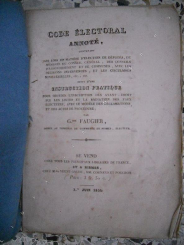 Chez Veuve Gaude a Nimes, 1er juin 1834. Format 15x22 cm, broche, 171 pages. Couverture froissee, interieur intact.Bon etat.