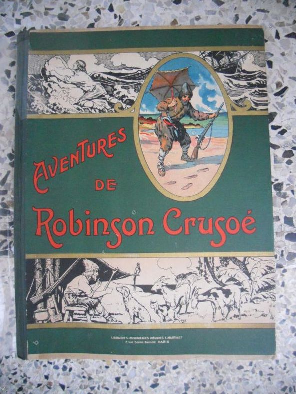 Cartonnage frais mais qui porte à tort au dos le titre “Robinson suisse“, le texte est bien celui de Daniel Defoe“Aventures de Robinson Crusoe“, curieuse erreur du relieur car l'éditeur Lehuby a bien publié une édition du Robinson Suisse mais en 1852, ici il s'agit bien de l'édition de Robinson Crusoe de 1843 (celle de 1857 du même éditeur n'a pas le même nombre de pages)..( GrF)