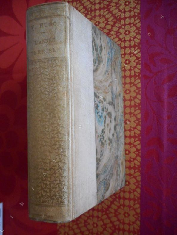 Edition en partie originale et ''première édition définitive''. (in Le Quillec). Exemplaire sous reliure signée Ed. Laügt à Pau. ''Carnage, sang et épouvanteS règnent dans L'Année terrible. Hugo se montre conscient d'une graduation dans les formes de la violence, comme si, à mesure que la société française s'approchait du but, les formes prises par la violence s'exacerbaient. ''L'avenir est un monstre avant d'être un archange''., Mais il ne délaisse pas ici l'analyse sociale. De même que, très vite, l'analyse politique ressurgit ; défense de la République et de la Révolution. Mais la violence paroxystique de L'Année terrible est constatée par Hugo comme faisant partie des hors-normes : temps de dérèglement, où l'esprit s'efface devant l'instinct, d'où la nécessité de réaffirmer qu'au dessus de l'un et de l'autre surnage ce principe supérieur : le droit. Or, affirme Hugo, dans la France de 1871, ''la loi opprime le droit''. Dès 1830, Hugo avait résumé en une formule forte son sentiment sur les rapports du pouvoir, du droit et de la violence : ''En matière de pouvoir, toutes les fois que le fait n'a pas besoin d'être violent pour être, le fait est droit''. (Jean-Claude Caron). Carteret I, Le Trésor du bibliophile romantique et moderne, p. 423 - Clouzot, Guide du bibliophile français, p. 92 - Vicaire IV, Manuel de l'amateur de livres du XIXème, 344 - Rahir, La Bibliothèque de l'amateur / Guide des livres les plus estimés, p. 465 (pour l'originale de 1872) - Le Quillec, Bibliographie critique de la Commune de Paris, 1237. Quelques frottements affectant le papier marbré des plats. Un mors fendillé (sans conséquence). Coiffe supérieure arasée. Feuillets légèrement oxydés. Présence de quelques rousseurs dans le corps d'ouvrage. Du reste, belle condition.