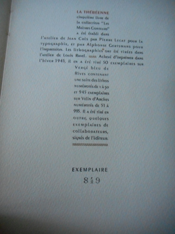Jean Cres, 1945. Format 11x17 cm, 67 pages. Exemplaire sur velin d'Arches, n°849/945. Sous emboitage editeur. Collection "Les Maîtres Conteurs". Très bel exemplaire.