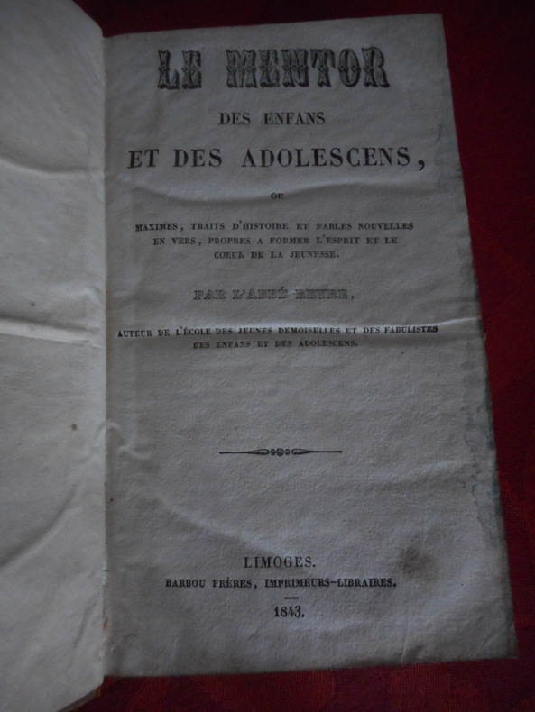 Limoges, Barbou freres, 1843. Format 11x18 cm, 216 pages. Reliure plein cuir raciné. Bon état.