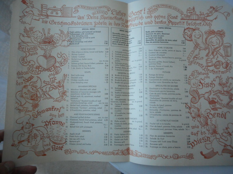 Lot de 2 menus, au format 21x30 cm. Un intégralement en langue allemande et un autre en 3 langues (anglais, italien, francais). Très bon état.