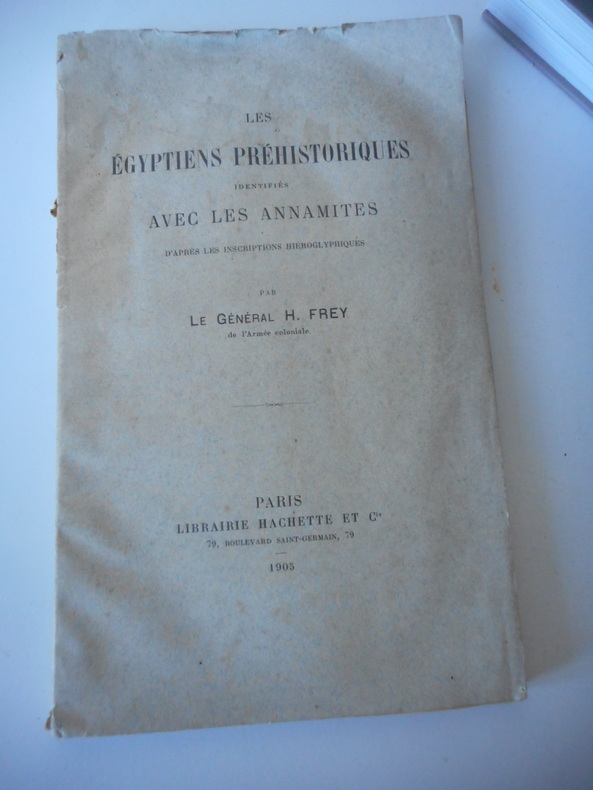 2 ff.n.ch., 106 pp.Unique édition. Outre une brillante carrière dans les troupes coloniales, au Sénégal et en Indochine, le général Henri Frey (1847-1932) se piquait d'écriture et d'érudition. Cette étrange thèse ne fut évidemment pas confirmée ni reprise par la suite ...Envoi autographe de l'auteur au commandant Etienne Lunet de Lajonquières [ici orthographié Jonquières] (1861-1933), de l'infanterie de marine, archéologue et ethnographe, et aussi organisateur de la conservation des Monuments historiques de l'Indochine