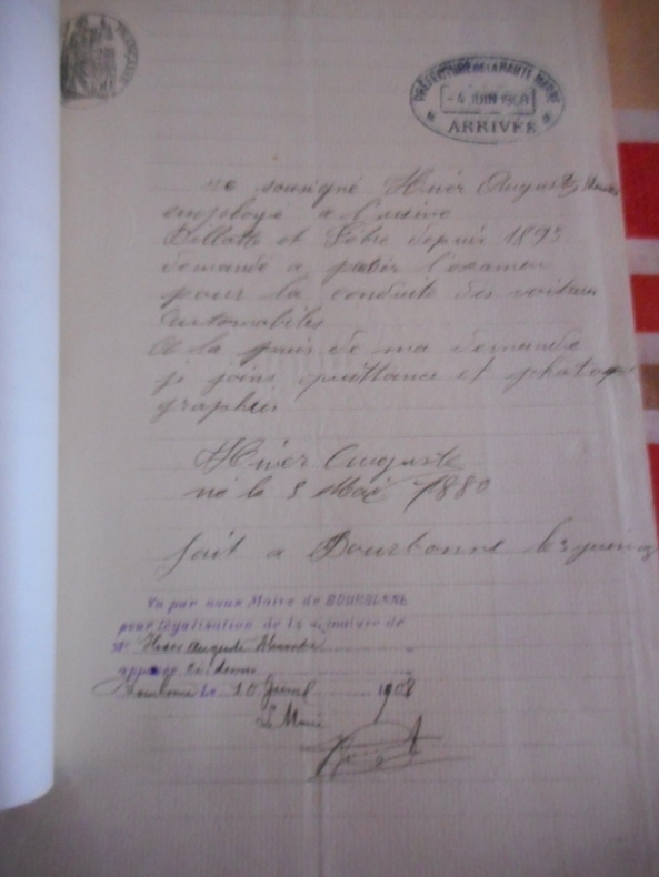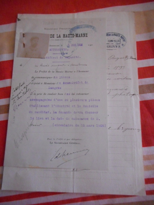 3 documents / 1) une photo (peu visible) 2) une demande du Prefet de la Haute-Marne 3) un document manuscrit du demandeur, à passer l'examen de capacité.