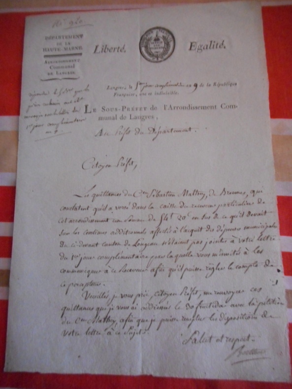 Document authentique à en-tête au format 20x29 cm, daté du 5eme jour complémentaire de l'an 9 (22 septembre 1803) . Très bon état.