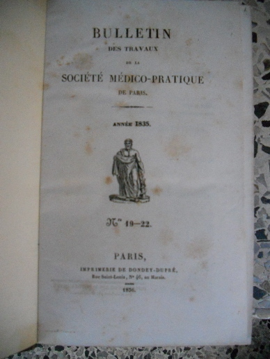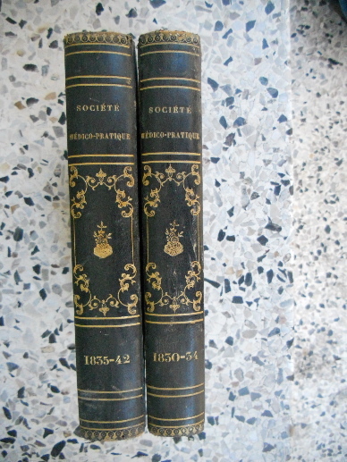 Paris, 1829 a 1842. Deux volumes in-8°, format 13x21 cm, jolie demi-reliure dos lisse a fers restauration, dos marque "Societe / medico pratique / 1830-1834" et"Societe / medico pratique / 1835-1842". Quelques rousseurs eparses dans le texte et legeres epidermures sur les plats.Bon etat.