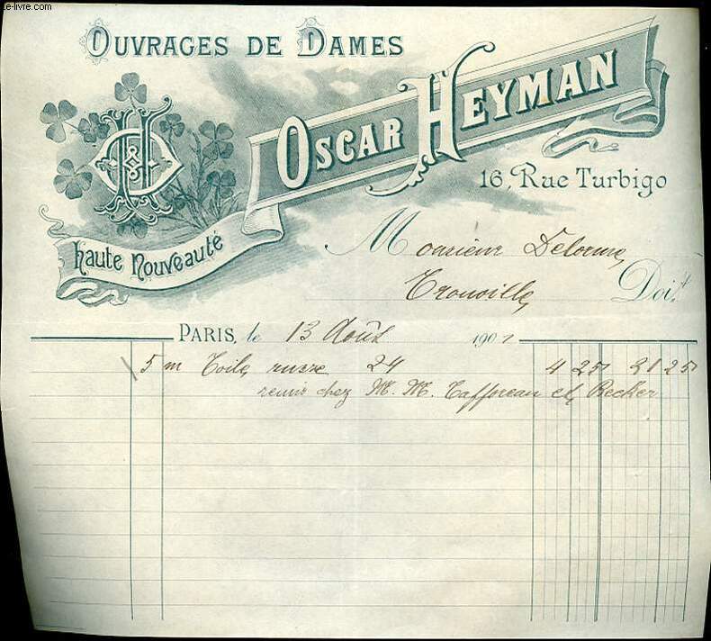 ***. 13-08-1907. In-12. Broché. Bon état, Couv. convenable, Dos satisfaisant, Intérieur frais. 1 facture ancienne de 27 x 21 cm. Illustrée d'une en-tête verte et blanche representant un bandeau et sur le coté gauche une lettre H calligraphiée sur un motif végétal.. . . . Classification : 200-Affiches Corrida