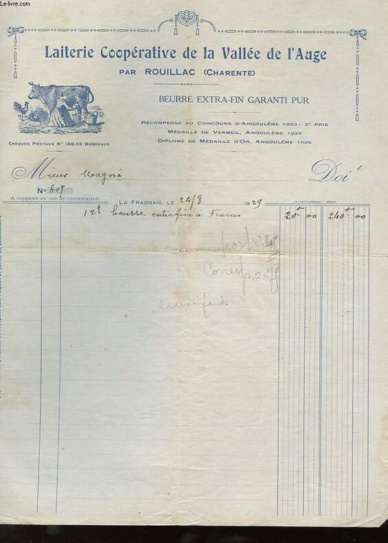 ***. 1929. In-12. Broché. Bon état, Couv. convenable, Dos satisfaisant, Intérieur frais. 1 facture ancienne de 27 x 21 cm. Illustrée d'une femme qui fait la traite du lait d'une vache dans le coin supérieur droit.. . . . Classification : 200-Affiches Corrida