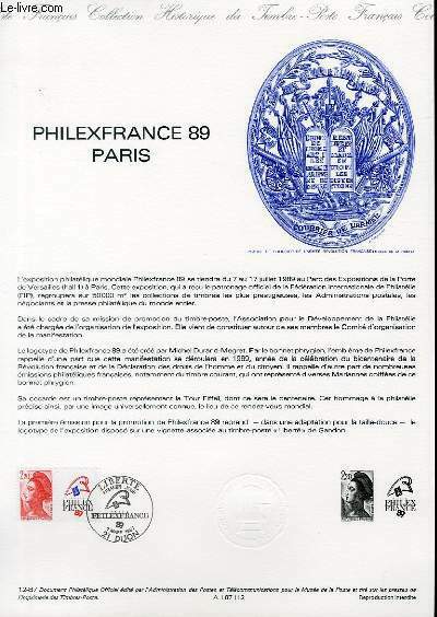 LA POSTE. 07-03-1987. In-12. Broché. Bon état, Couv. convenable, Dos satisfaisant, Intérieur frais. Document philatélique officiel de format 21 x 29,7 cm tiré sur Vélin pur chiffon d'Arches réalisé par l'administration des postes et télécommunication pour le musée postal. Il est composé d'un timbre original oblitéré du cachet premier jour, du texte de la notice officielle, de l'impression du poinçon original, d'une illustration gravée monochrome et d'une impression à sec de l'imprimerie du timbre.. . . . Classification : 20-Documents Philatéliques
