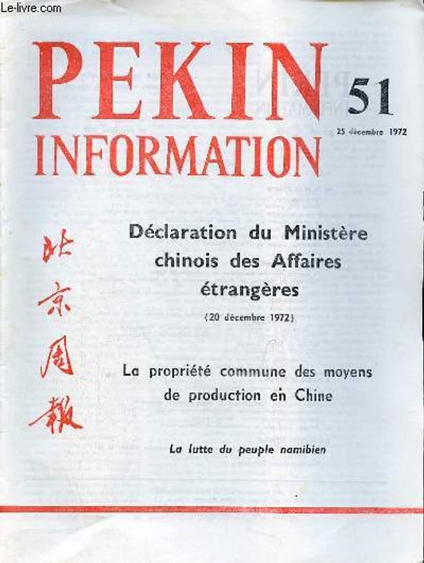 Sommaire : La propriété commune des moyens de production en Chine - déclaration du Ministère des affaires étrangères de la république de Chine 20 déc. 1972 - déclaration du gouvernement révolutionnaire provisoire de la république du sud viet nam - point de vue de la chine sur la convocation d'une conférence sur le droit des mers et des océans - opposition à la représentation du régime fantoche de Phnom Penh - le peuple namibien a droit à l'autodétermination et à l'indépendance - la lutte du peuple namibien - constructions hydrauliques et industrie énergétique - affaires financières et monétaires. Classification Dewey : 70.49-Presse illustrée, magazines, revues