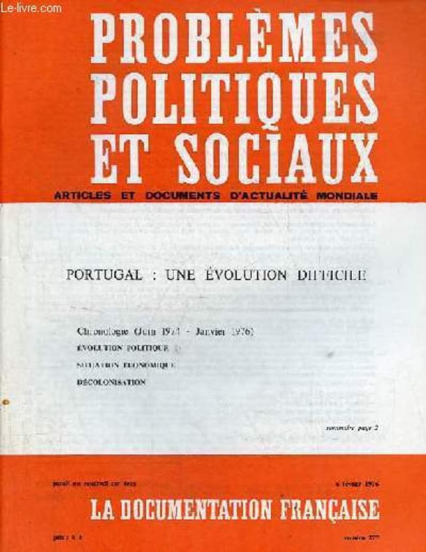 Sommaire : Portugal : une évolution difficile - chronologie (juin 1974-janvier 1976) - évolution politique - situation économique - décolonisation. Classification Dewey : 70.49-Presse illustrée, magazines, revues