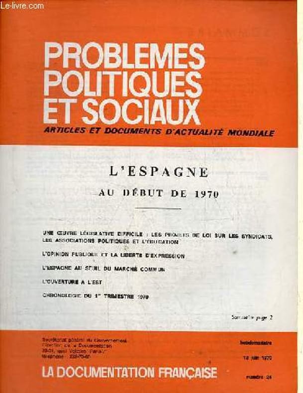 Sommaire : L'Espagne au début de 1970 - une oeuvre législative difficile : les projets de loi sur les syndicats, les associations politiques et l'éducation - l'opinion publique et la liberté d'expression - l'Espagne au seuil du marché commun - l'ouverture à l'est - chronologie du 1er trim. 1970. Classification Dewey : 70.49-Presse illustrée, magazines, revues