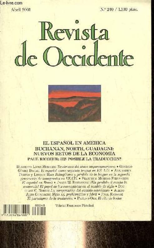 Sommaire : El espanol en America Buchanan, North, Guadagni : nuevos retos de la economia Paul Ricoeur : es posible la traduccion ? - Humberto Lopez Morales : tendencias del léxico hispanoamericano - Gonzalo Gomez Dacal : el espanol como segunda lengua en EE.UU - Alejandro Portes y Lingxin Hao : bilinguismo y perdida de la lengua en la segunda generacion de inmigrantes en EE.UU - Francisco Moreno Fernandez : el espanol en Brasil etc. Classification Dewey : 460-Langues espagnole et portugaise