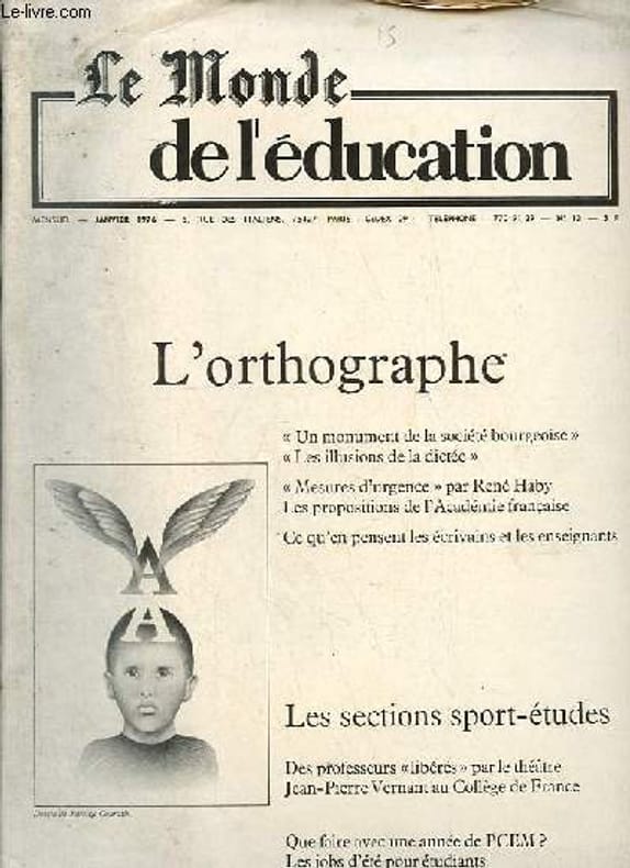 Sommaire : La question cadeau surprise Jean Gueonot - un monument de la société bourgeoise, Jacques Cellard - les illusions de la dictée, Hélène Huot - mesures d'urgence, René Haby - corriger les plus choquantes anomalies, Jean Mistler - qu'en pensent les écrivains ? l'érosion, pas la chirurgie, Jean Dutourd ; accordons le plaisir de tracer, Roland Barthes; je suis prudemment réformiste Hervé Bazin - qu'en pensent les enseignants ? - les sections sport études, Daniele Mennesson - Allemagne : l'université intégrée d'Essen Daniel Vernet - Italie : la réforme devant le parlement, Robert Solé - des professeurs libérés par le théâtre - les aristocrates du lycée international - le chef d'établissement est il encore un éducateur ? Henri Brunel etc. Classification Dewey : 70.49-Presse illustrée, magazines, revues