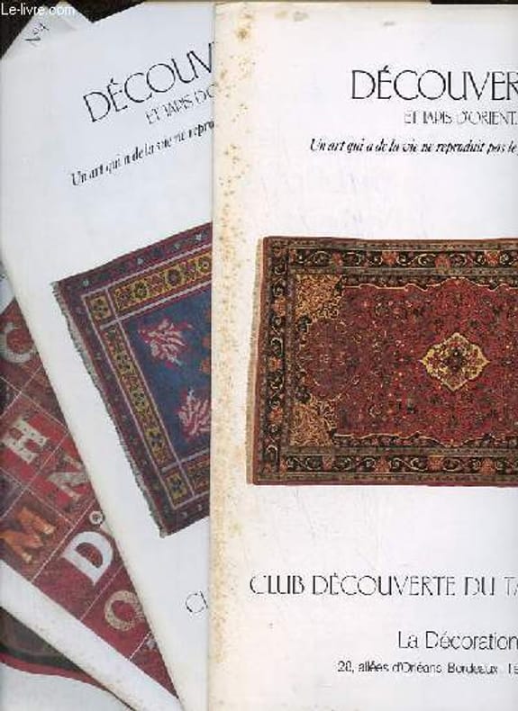 "Club découverte du tapis d'orient. non daté. In-4. Broché. Bon état, Couv. convenable, Dos satisfaisant, Intérieur frais. n°3 : 23 pages + 16 pages ""lettre d'information"" - n°4 : 7 pages + 16 pages - n°5 : paginé de 17 à 36 - n°6 : Paginé de 37 à 56 - pages agrafées - nombreuses illustrations en couleurs et en noir et blanc dans le texte - rousseurs sur les plats.. . . . Classification Dewey : 746-Art et artisanat des textiles"