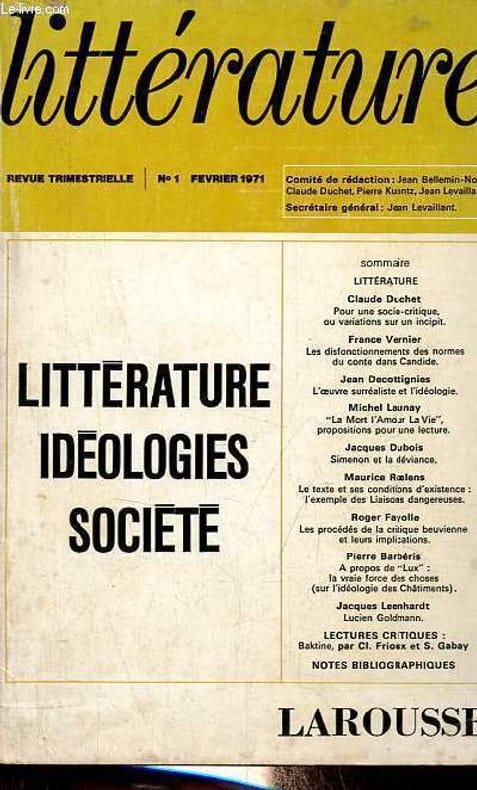 Sommaire : Claude Duchet, pour une socio-critique ou variations sur un incipit - France Vernier, les disfonctionnements des normes du conte dans Candide - Jean Decottignies, l'oeuvre surréaliste et l'idéologie - Michel Launay, la mort l'amour la vie propositions pour une lecture - Jacques Dubois, Simenon et la déviance - Maurice Roelens, le texte et ses conditions d'existence : l'exemple des liaisons dangereuses - Roger Fayolle, les procédés de la critique beuvienne et leurs implications - Pierre Barbéris, a propos de lux la vraie froce des choses - Jacques Leenhardt, Lucien Goldmann - Claude Frioux, Baktine devant ou derrière nous - Simone Gavay, Rabelais des années 30 à 1970. Classification Dewey : 70.4417-L'illustration / Figaro salon