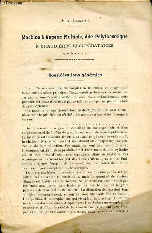 Considérations générales - la machine à vapeur multiple ou polythermique - le transformateur ou chaudière récupératrice - exemple - avantages de la machine multiple. Classification Dewey : 620-Art de l'ingénieur et activités connexes