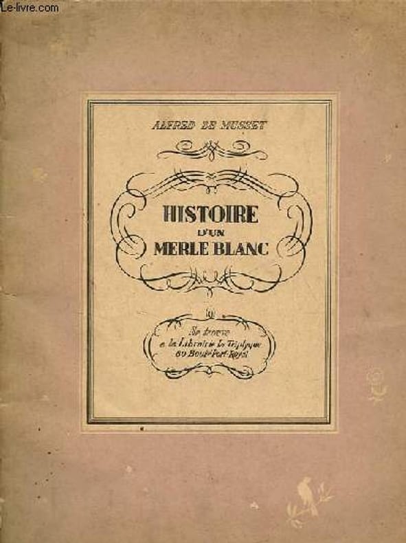 "Note - Tout comme dans les fables, les oiseaux de ce conte parlent. - Ce jeune Merle romantique au plumage si rare, semble bien être Musset lui-même. - Le Kacatogan, selon certains, personnifie le grand poète Victor Hugo. - Balzac, Rachel et bien d'autres sans doute, sont métamorphosés dans cette histoire. - On reconnaîtra facilement, dans la Merlette le personnage de George Sand." 3 pl. h.t. en couleur dont une à double page, 9 pl. h.t. en noir et 8 vignettes dans le texte de Marcel Carter. Couverture quelque peu empoussiérée, sinon, très bel exemplaire.