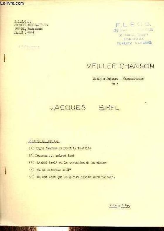F.L.E.C.C.. non daté. In-4. Broché. Etat d'usage, Couv. convenable, Agrafes rouillées, Papier jauni. 12 pages dactylographiées - tampons sur le 1er plat.. . . . Classification Dewey : 782.92-Chanteurs