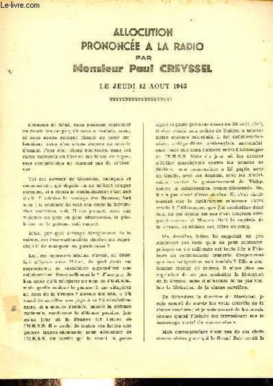 Lot d'allocution prononcée à la radio par Monsieur Paul Creyssel : le jeudi 7 octobre 1943 + le jeudi 16 sept.1943 + le 9 avril 1942 + le 7 mai 1942 + 14 mai 1942 + 28 mai 1942 + prière pour les morts de 1940 18 juin 1942 + 2 juillet 1942 + 23 juillet 1942 + 15 octobre 1942 le complot contre nos ouvriers + 5 novembre 1942 conseils a un prisonnier libéré + 25 mars 1943 + 29 avril 1943 + 3 juin 1943 + 10 juin 1943 + 24 juin 1943 + 8 juillet 1943 + 30 juillet 1943 + 5 aout 1943 variations de la conscience universelle + 12 aout 1943 . Classification Dewey : 940.53-Seconde Guerre mondiale 1939-1945
