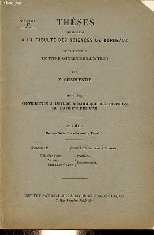 Institut National de la Recherche Agronomique. 1954. In-8. Broché. Etat d'usage, 1er plat abîmé, Dos satisfaisant, Intérieur frais. 91 pages - nombreux tableaux en noir et blanc dans et hors texte - quelques figures en noir et blanc dans le texte - coin en tête absent sur le 1er plat.. . . . Classification Dewey : 634.8-Viticulture, vin