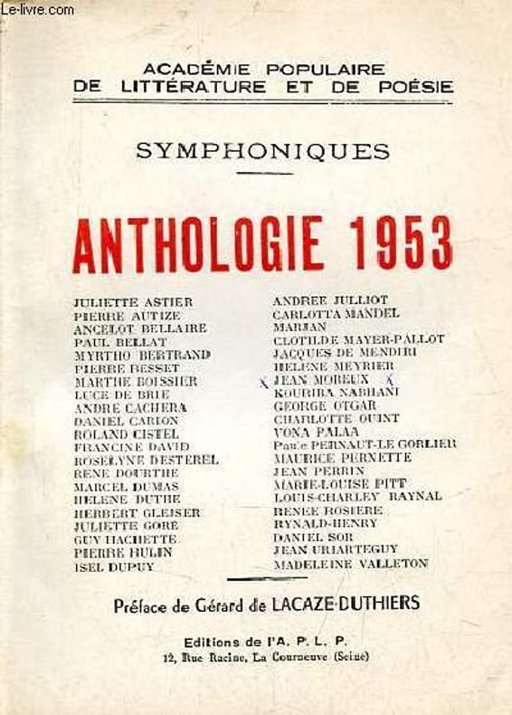 Préface de Gérard de Lacaze-Duthiers - Juliette Astier - Pierre Autize - Ancelot Bellaire - Paul Bellat - Myrtho Bertrand - Pierre Besset - Marthe Boissier - Luce de Brie - Andre Cachera - Daniel Carion - Roland Cistel - Francine David - Roselyne Desterel - Rene Dourthe - Marcel Dumas - Helene Duthe - Herbert Gleiser - Juliette Gore - Guy Hachette - Pierre Hulin - Isel Dupuy etc. Classification Dewey : 840.8-Anthologies, recueils