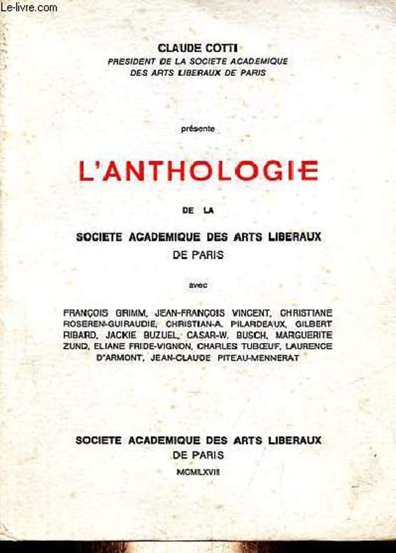 L'anthologie de la société académique des arts liberaux de Paris avec François Grimm, Jean François Vincent, Christiane Roseren-Guiraudie, Christian-A, Pilardeaux, Gilbert Ribard, Jackie Buzuel, Casar W.Busch, Marguerite Zund, Eliane Fride Vignon, Charles Tuboeuf, Laurence D'Armont, Jean Claude Piteau-Mennerat. Classification Dewey : 840.8-Anthologies, recueils