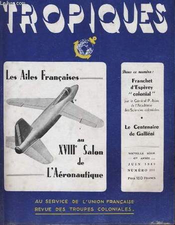 "Franchet d'Espérey colonial par AZAN ; Galliéni, les arts et la langue malgaches par le Général de Division CASSEVILLE ; Rommel ""le Maréchal du désert"" (2è partie) par BONNET ; Réflexions sur la guerre ""dite colonial"" (fin) par CHARBONNEAU-BAUCHAR ; Le XVIIIè Salon de l'Aéronautique par L.F. ; Le centenaire de galliéni ; Altitude 2.400 ; Tableau des principaux évènements internationaux par BLAIRY ; Nouvelles de l'Union Française ; Le général Jung ; Bibliographie ; Partie officielle. Classification Dewey : 900-GEOGRAPHIE, HISTOIRE, SCIENCES AUXILIAIRES DE L'HISTOIRE"