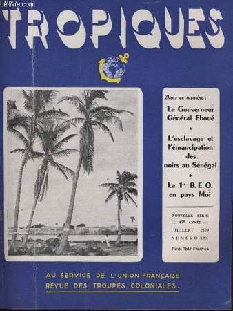"La Gouverneur Général Eboué par Le général de divison des troupes coloniales MARCHAND ; L'esclavage et l'émancipation des noir au sénégal par DEMOUGEOT ; Réception du général ingold à l'academie des sciences coloniales ; Action de la 1ère B.E.O. en pays moï S.E.I.T.C. ; Rommel la ""Maréchal du désert"" (fin) par Cdt BONNET ; Un coin du Viet-nam dans le métropole par M.T. A Nango par ARTOIS ; Hommage a Galliéni par SABATTIER ; Tableau des principaux évènements internationnaux par BLAIRY ; Nouvelles de l'Union Française par R.G. ; Bibliographie ; Partie oficielle Classification Dewey : 900-GEOGRAPHIE, HISTOIRE, SCIENCES AUXILIAIRES DE L'HISTOIRE"