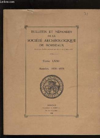 42 numéros in-4 br., Société Archéologique de Bordeaux, 1976-2020. Rappel du titre complet : Bulletin et Mémoires de la Société Archéologique de Bordeaux [Puis :] Revue Archéologique de Bordeaux (Série suivie de 42 Volumes, du Tome LXXI : Années 1976-1978 au Tome CXII : Année 2020) [ Contient : ] Tome LXXI : Années 1976-1978 - Tome LXXII : Années 1979-1981 - Tome LXXIII 1982 - Tome LXXIV 1983 - Tome LXXV 1984 - Tome LXXVI 1985 - Tome LXXVII 1986 - Tome LXXVIII 1987 - Tome LXXIX 1988 - Tome LXXX 1989 - Tome LXXXI 1990 - Tome LXXXII 1991 - Tome LXXXIII 1992 - Tome LXXXIV 1993 - Tome LXXXV 1994 - Tome LXXXVI 1995 - Tome LXXXVII 1996 - Tome LXXXVIII 1997 - Tome LXXXIX 1998 - Tome XC 1999 - Tome XCI 2000 - Tome XCII 2001 - Tome XCIII 2002 - Tome XCIV 2003 - Tome XCV 2004 - Tome XCVI 2005 - Tome XCVII 2006 - Tome XCVIII 2007 - Tome XCIX 2008 - Tome C 2009 - Tome CI 2010 - Tome CII 2011 - Tome CIII 2012 - Tome CIV 2013 - Tome CV 2014 - Tome CVI 2015 - Tome CVII 2016 - Tome CVIII 2017 - Tome CIX 2018 - Tome CX 2018 - Tome CXI 2019 - Tome CXII 2020