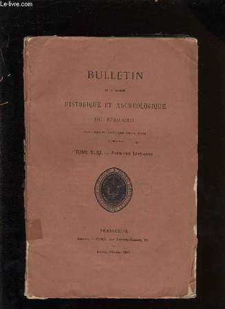 Excursions archéologique à Ecorneboeuf, à la grotte de Campniac et à La Boissière par ROUX ; Archives du chapitre de Périgueux par DESCOMBES ; L'ermitage du Pont de la Cité par DURAND ; Contrats d'apprentissage de la région du Mussidan, au XVIIIe siècle par GRENIER. Ex-libirs d'H. de Bertin et de C. de Beaumont, premiers barons du Périgord par SAINT-SAUD. L'origine de de Mourcin, Son alliance avec les Rafaillac de la Servolle par BEAU VERDENEY. Classification Dewey : 908.447-Régionalisme : Aquitaine