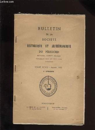 "Inventaire de l'iconothèse de la Socité historique et archéologique du Périgord (suite et fin) par SECRET ; La chatellenire et les seigneurs de Montcuq (suite) par MARSAC ; Curés et vicaire du diocèse de Périgueux en 1692 (suite et fin) par BECQUART ; La charpente e l'ancienne Abbaye de Brantôme par PONCEAU ; Lettre de J.B.L. Pellissier de Barry à la marquise de Cosnac par SECRET ; La ""dinastieé des Rey, médecins ou Bugue par SADOUILLET-PERRIN. Classification Dewey : 908.447-Régionalisme : Aquitaine"