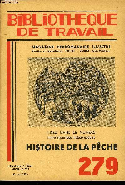 Coll. "Bibliothèque de Travail" n° 279, Cannes, Freinet, in-8, agrafé, couv. ill. en noir éd., 24 pp., nb. reproductions de documents anciens en noir, L'histoire de la pêche depuis la préhistoire jusqu'à la fin du XIXe siècle … en résumé ! Bon état