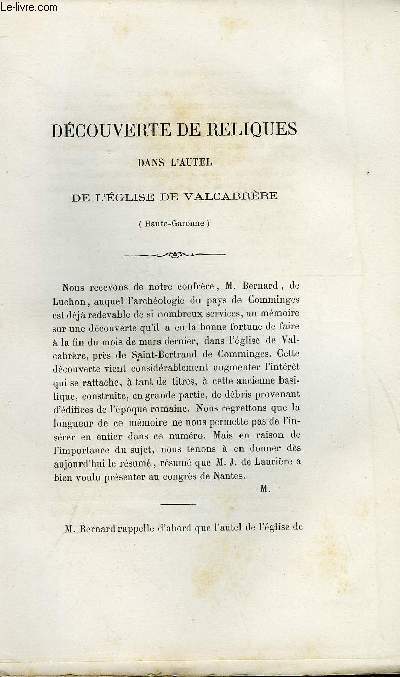 SOCIETE FRANCAISE D'ARCHEOLOGIE. 1886. In-12. Broché. Bon état, Couv. convenable, Dos satisfaisant, Intérieur frais. Paginé de 501 à 516. Héliogravure en noir et blanc sous serpente d'un chapiteau, vase et sceau trouvés dans l'autel de Valcabrère.. . . . Classification Dewey : 930.1-Archéologie
