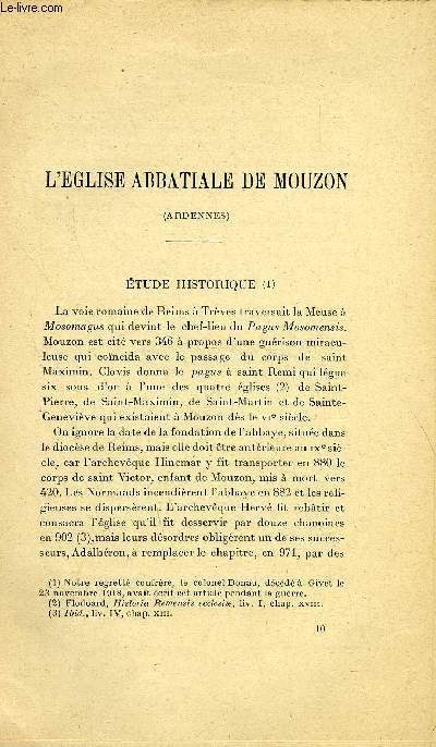 SOCIETE FRANCAISE D'ARCHEOLOGIE. 1920. In-12. Broché. Bon état, Couv. convenable, Dos satisfaisant, Intérieur frais. Paginé de 137 à 164. Quelques photos en noir et blanc hors texte de l'église de Mouzon. Gravure en noir et blanc hors texte de la coupe longitudinale du coeur.. . . . Classification Dewey : 930.1-Archéologie