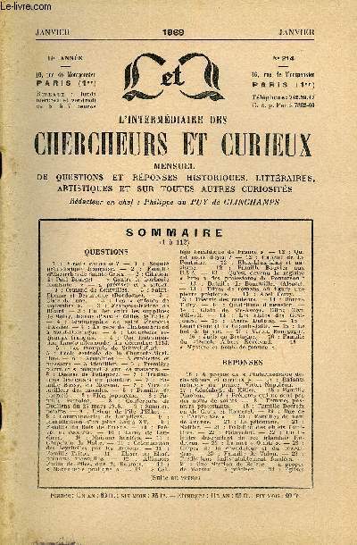 Mensuel de questions et réponses historiques, littéraires, artistiques et sur toutes autres curiosités. Sommaire : QUESTIONS 1 : Virgile canonisé ? — 1: Sociétépréhistorique française. — 2:FamilledTEscorches de Sainte-Croix.. — 2 : Citation de Paul Bourget — « Contre la barbarie montante... » — à préciser et à situer.—3 : Osmond de Centvilles. — 3 : Saint-Etienne et Beauronne (Dordogne). — 3 : Clair de lune. — 3 : Les « enfants de septembre ». — 3 : François-Isidore de Ricard. — 3 : Un lien entre les supplices de Molay, Jeanne d’Arc et Gilles de Rais ?—4 : Iconographie de saint François d’Assise. — 4 : Le père de Chateaubriand à Saint-Domingue. — 4 : Coquetèles régionaux français. — 4 : Une fraternisation franco-allemande, fin décembre 1914.—5 : Les marquis de Schweinfurt. —5 : Ecole centrale de la Charente-Mari-time. — 6 : Armoiries — 3 croisettes et massacre — à identifier. — 6 : Première pierre et « bouquet » sur les maisons. —6: Désirée de Pelleporc. — 7 : Traduc-tions françaises du psautier. — 7 : Famille Bussy, en Morvan. — 7 : Vers le meilleur des mondes. — 8 : Famille de Lorgeril. — 8 : Fiée, toponyme. — 8 : Famille Perrolaz. — 8:Conférence deDoullens du 26 mars 1918. — 9 : Sanuier, peintre. — 9 : Retour de l’île d’Elbe. — 9 : Commanderies de templiers. — 9:Identification d’un jeton Louis XV. — 9 : Famille du Bois de Fresne. — 10 : Prévôt ou écoutète. — 10 : Leroy de Len-chère. — 10 : Maisons hantées. — 11 : Chapelain de Malte. — 11 : Colonisation des Seychelles par les Bretons. — 11:Famille Tricot. — 11 : Elisée ou Elisé, prénoms masculins. — 12:AlliancesFortia de Piles, duc de Baumes. — 12 : « Maçonnerie pratique ». — 12 : « Collège héraldique de France ». — 12 : Qui est notre doyen ? — 12 : Gabriel de La Fontaine. — 12 : Klux-klux-klan et nazisme. —12:Famille Bouvier auxU.S.A. — 13 : Qu’est devenu le registre « bms » des protestants de Pontorson ?—13 : Bataille de Bourwiller (Alsace).—13 : Titres de romans où figure une pierre précieuse. — 13 : Abel Ferry. —13: Théorie des couleurs. — 14 : Barons Thiry. — 14 : Quatrième dimension. —14:Glain de Ste-Avoye, Glin; Glynd’Ewelt. -— 14:Les aigles des Cent-jours. — 15 :Pierre Dufouq. — 15 :Courbevoie et la Grande-Jatte. — 15 : Le but de la vie. — 15 : Viron, Bourgogne.—16 : Juifs en Bretagne. — 16 : Familledu vicomte Albert Révérend. — 16:« Mystère et boule-de-gomme ».RÉPONSES 16 : A propos de « l’Intermédiaire des chercheurs et curieux ». — 17 : Enfants naturels du prince Victor-Napoléon. — 17 : Généalogie de Hitler. — 18 : Famille Pinchon. — 18 : Prénoms qui ne sont pas des noms de saints. — 18 : Femmes pasteurs protestants. — 18 : Famille Decroix ou de Croix et Hamerel. — 19 : Rue de « l’Arbre-Sec ». — 20 : Familles du nom de France. — 21 : Le pétomane. — 21 : Nattier. — 21 : Datation des objets familiers. — 22 : Balavoinë. — 22 : Un illustre descendant du roi irlandais Ru-dricus. — 22 : Le mot « Otaïti ». — 23 : Crêpes de la Chandeleur et du mardi-gras. — 23 : Famille de Valon. 23 : Prédictions indiscutablement fondées. — 24 : Une citation de Balzac — à propos de Marsay — à préciser. Classification Dewey : 1-Le savoir