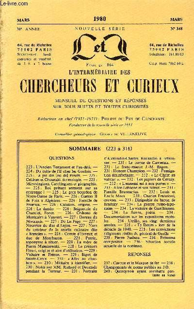 Mensuel de questions et réponses historiques, littéraires, artistiques et sur toutes autres curiosités. Sommaire : QUESTIONS 223: L’Ancien Testament et l’au-delà. —224: Du culte de l’if chez les Gaulois. —225: Le pic des [ou de] Posets. — 225 : Celdran et Chouraki, étymologie. — 225 : Mérovingiens, Carolingiens et géographie.—225 : Roi prêtant serment sur sa couronne ? — 225 : Le gros bourdon de Notre-Dame de Paris. — 226 : Gaston II de Foix à Algésiras. — 226 : Famille de Proença. — 226 : Caladois, origine. —226: La dando. — 226 : Seigneurie du Chazelet, Forez. — 226 : Château de Montcalm à Vauvert. — 227 : Doreau du Nivernais. — 227 : De La Fage. — 227 : Nourrice du duc d’Anjou. — 227 : Nom du créateur de la recette culinaire dite « Bresoles ». — 228 : Comte d’Evreux et duc de Montbazon. — 228 : Perrin, toponyme à situer. — 228 : La mère de Pierre Maleszewski. — 228 : Le prénom Fleuri, origine et aire d’utilisation. —229 : Voltaire et Fréron. — 229 : Bigot de Sainte-Croix. — 230 : « Aller au charbon ». — 230 : Militaire à identifier. —230: Notes sur MM. Richard et Daumale pendant la Terreur. — 231 : Portraits d’Alexandre-Charles Rousselin à retrouver. — 231 : Le comte de Camerata. — 231 : Le franc-maçon J.-M. Ragon. — 231 : Honoré Champion. — 232 : Fumigation désinfectante. — 232 : « Le Christ au Vatican ». — 232 : Les papiers de Cercay.—232 : « L’ennemi est à nos portes ». — 233 : Alice Lehaène et son tuteur. — 233 : Famille Brunnarius. — 233 : Louis et Emile Mors. — 233 : Charles Francioni, œuvres. — 233 : Dirigeable du baron de Bradsky. — 234 : La guerre russo-japo-naise. — 234 : La victoire de Gumbinnen.—234 : Le Senne, poète. — 234 : Documentation sur les expositions mobiles. — 234 : Utrillo, ses vingt dernières années. — 235 : « Te Deum » lors de la débâcle de 1940. — 235 : Les convictions religieuses réelles du général de Gaulle. — 235 : Pierre Pasleau. — 236 : Prénoms composites. — 236 : Situation sociale actuelle de la noblesse.REPONSES 237 : Cavoye et le Masque de fer. — 238 : Changements de noms publiés au J.O. Classification Dewey : 1-Le savoir