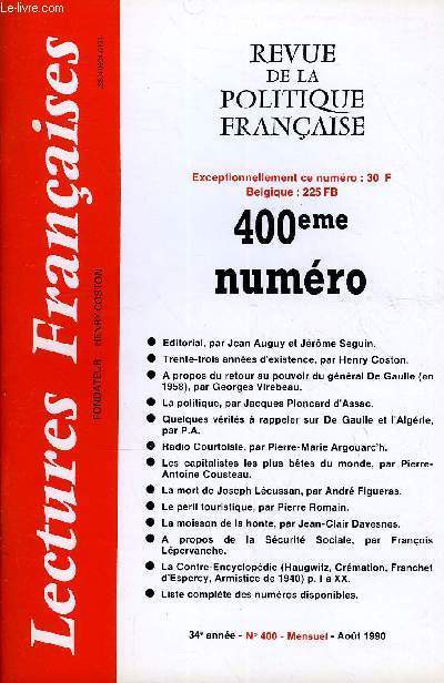 Revue de la politique française. Sommaire : 400emenuméro•Editorial, par Jean Auguy et Jérôme Seguin.•Trente-trois années d’existence, par Henry Coston.•A propos du retour au pouvoir du général De Gaulle (en 1958), par Georges Virebeau.•La politique, par Jacques Ploncard d’Assac.•Quelques vérités à rappeler sur De Gaulle et l’Algérie, par P.A.•Radio Courtoisie, par Pierre-Marie Argouarc’h.•Les capitalistes les plus bêtes du monde, par Pierre-Antoine Cousteau.•La mort de Joseph Lécussan, par André Figueras.•Le péril touristique, par Pierre Romain.•La moisson de la honte, par Jean-Clair Davesnes.•A propos de la Sécurité Sociale, par François Lépervanche.•La Contre-Encyclopédie (Haugwitz, Crémation, Franchet d’Esperey, Armistice de 1940) p. I à XX.•Liste complète des numéros disponibles. Classification Dewey : 320-Science politique