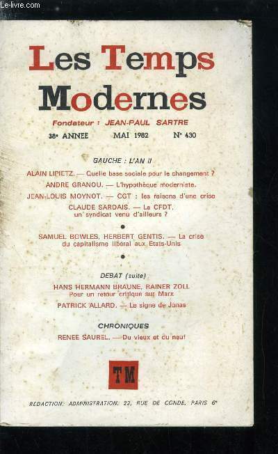 Revue fondée par Jean-Paul Sartre et Simone de Beauvoir. Sommaire : Quelle base sociale pour le changement ? par Alain Lipietz, L'hypothèque moderniste par André Granou, CGT : les raisons d'une crise par Jean Louis Moynot, La CFDT, un syndicat venu d'ailleurs ? par Claude Sardais, La crise du capitalisme libéral aux Etats Unis par Samuel Bowles et Herbert Gentis, Pour un retour critique sur Marx par Hans Hermann Braune et Rainer Zoll Classification Dewey : 70.49-Presse illustrée, magazines, revues
