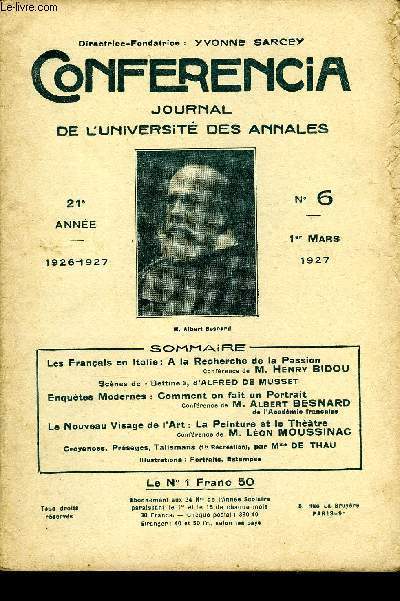 Journal de l'université des annales. Sommaire : Les Français en Italie: A la Recherche de la PassionConférence de M. Henry BIDOUScènes de « Bettine », d’ALFRED DE MUSSETEnquêtes Modernes : Comment on fait un PortraitConférence de M. Albert BESNARDde l'Académie françaiseLe Nouveau Visage de l’Art : La Peinture et le ThéâtreConférence de M. Léon MOUSSINACCroyances, Présage*, Talismans (1re Récréation), par Mme DE THAU Classification Dewey : 70.493-Les annales / Conferancia