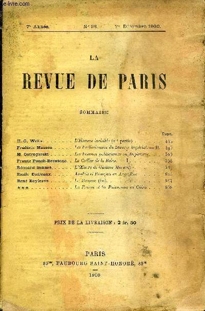 Sommaire : H. G. Wells. . .Frédéric Masson M. Ostrogorski .Frantz Funck-Brentano. . Edouard Schuré,Émile Daireaux.René Boylesve .***. ......L’Homme invisible (ire partie)Les Préliminaires du Divorce impérial. — IL Les Femmes politiciennes en Angleterre...Le Collier de la Reine. — I .VŒuvre de Gustave Moreaiï. ?Anglais et Français en Argentine La Becquée (fin).La France et les Puissances en Chine Classification Dewey : 70.49-Presse illustrée, magazines, revues