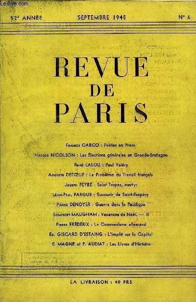 Sommaire : Francis CARCO : Poètes en Prose Harold NICOLSON : Les Élections générales en Grande-Bretagne René LALOU : Paul Valéry Auguste DETŒUF : Le Problème du Travail français Joseph PEYRÉ : Saint Tropez, martyr Léon-Paul FARGUE : Souvenir de Saint-Exupéry Pierre DENOYER : Guerre dans le Pacifique Somerset MAUGHAM : Vacances de Noël. — Il Pierre FRÉDÉRIX : Le Communisme allemand Ed. GISCARD D'ESTAING : L'Impôt sur le Capital E. MAGNE et P. AUDIAT : Les Livres d'Hîstoire Classification Dewey : 70.49-Presse illustrée, magazines, revues