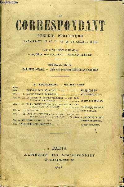 BUREAUX DU CORRESPONDANT. 25 MAI 1887. In-12. Broché. Bon état, Couv. convenable, Dos satisfaisant, Intérieur frais. Paginé de 593 à 784.. . . . Classification Dewey : 70.49-Presse illustrée, magazines, revues