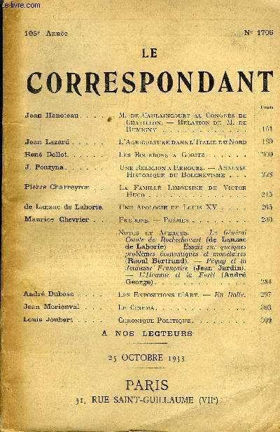 Sommaire : Jean Hanoteau. M. de .Caulaincourt au Congbès deChatillon. — Relation de M. de Rumigny. Jean Lazard.. L’Agriculture dans l’Italie du NordRené Dollot. ..Les Bourbons a Goritz . .J. Pouzyna. Une Religion a Rebours. — AnalyseHistorique du Bolchevisme . . .Pierre Charreyron. La Famille Limousine de VictorHugo..de Lanzac de Laborie.Une Apologie de Louis XV .Maurice Ghevrier . Fredons. — Poèmes..Notes et Aperçus. — Le Général Comte de Rochechouart (de Lanzac de Laborie). -— Essais sur quelques problèmes économiques et monétaires (Raoul Bertrand). —r Péguy et la Jeunesse Française (Jean Jardin). — L’Homme et la Forêt (André George).André Dubosc .Les Expositions d’Art. — En Italie.Jean Morienval. Le Cinéma.Louis Joubert . Chronique Politique.. Classification Dewey : 70.49-Presse illustrée, magazines, revues