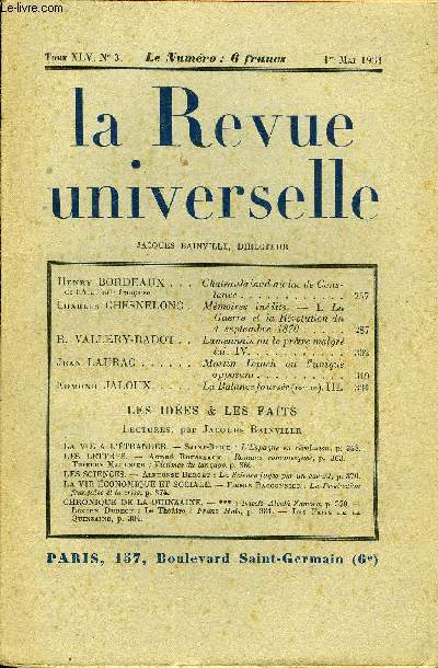 Sommaire : Henry BORDEAUX de l’Académie française. Chateaubriand au lac de ConstanceCharles CHESNELONG. Mémoires inédits. — I. La Guerre et la Révolution du 4 septembre 1870. R. VALLERY-RADOT. Lamennais ou le prêtre malgré lui. IV. Jean LAURAC. Martin Dauch ou l'unique opposant. Edmond JALOUX. La Balance faussée (roman). III.LES IDÉES & LES FAITSLectures, par Jacques BainvilleLA VIE A L’ÉTRANGER. — Saint-Brice : L’Espagne en révolution. LES LETTRES. — André Rousseaux : Romans romanesques. — Thierry Maulnier : Victimes du langage.LES SCIENCES. — Alphonse Berget : La Science jugée par un savant. LA VIE ÉCONOMIQUE ET SOCIALE. — Firmin Bacconnier : La Production française et la crise.CHRONIQUE DE LA QUINZAINE. — *** : Niceto Alcalá Zamora. — Lucien Dubech : Le Théâtre : Franz Hais. — Les Faits de la Quinzaine. Classification Dewey : 70.49-Presse illustrée, magazines, revues