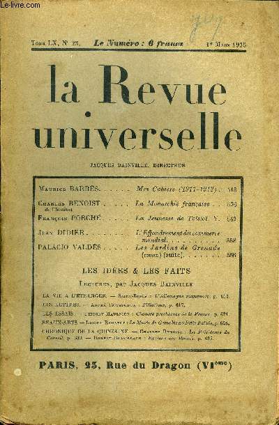 Sommaire : Maurice BARRÉS. Mes Cahiers (1911-1912).Charles BENOIST de l’Institut. La Monarchie française. François PORCHE. La Jeunesse de Tolstoï. V.Jean DIDIER. L’Effondrement du commerce mondial. PALACIO VALDÈS. Les Jardins de Grenade (roman) (suite). LES IDÉES & LES FAITSLectures, par Jacques BainvilleLA VIE A L’ÉTRANGER. — Saint-Brick : L’Allemagne manœuvre.LES LETTRES. — André Rousseaux : Filiations.LES ESSAIS. — Thierry-Maulnier : Chances prochaines de la France.BEAUX-ARTS. — Lucien Rebatet : Le Musée de Grenoble au Petit-Palais.CHRONIQUE DE LA QUINZAINE. — Charles Benoist : La Présidence du Conseil. — Robert Brasillach : Examen des Revues. Classification Dewey : 70.49-Presse illustrée, magazines, revues