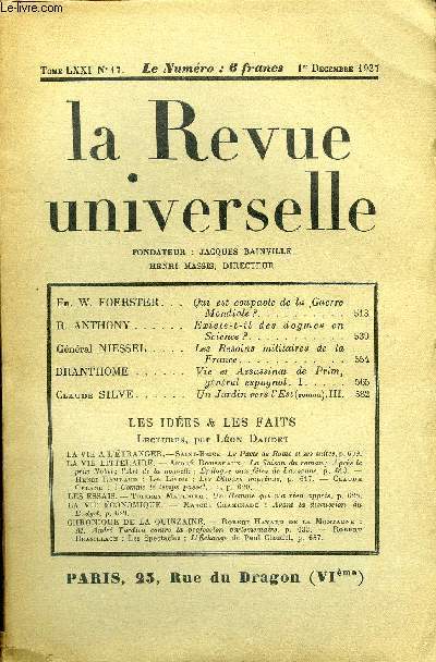 Sommaire : Fr. W.FOERSTER. Quiest coupable de la GuerreMondiale ?R. ANTHONY. Existe-t-il des dogmes en Science ?..GénéralNIESSEL. Les Besoins militaires de laFrance. BRANTHOME. Vie et Assassinat dePrim,général espagnol. I..ClaudeSILVE. Un Jardin vers l'Est (roman). III.LES IDÉES & LES FAITS Lectures, par Léon Daudet. LA VIE A L’ÉTRANGER. — Saint-Bricf. : Le Pacte de Rome et ses suites. LA VIE LITTÉRAIRE. — André Rousseaux : La Saison du roman; Après le prix Nobel; l’Art de la nouvelle; Épilogue aux fêtes de Lausanne. — Henri Rambaud : Les Livres : Les Détours imprévus. — Claude Ori.and : « Comme le temps passe! ».LES ESSAIS. — Thierry Maulnier : Un Homme qui n'a rien appris. LA VIE ÉCONOMIQUE. — Marcel Chaminade : Avant la discussion du Budget.CHRONIQUE DE LA QUINZAINE. — Robert Havard de la Montagne : M. André Tardieu contre la profession parlementaire. — Robert Brasillach : Les Spectacles : L’Échange de Paul Claudel. Classification Dewey : 70.49-Presse illustrée, magazines, revues