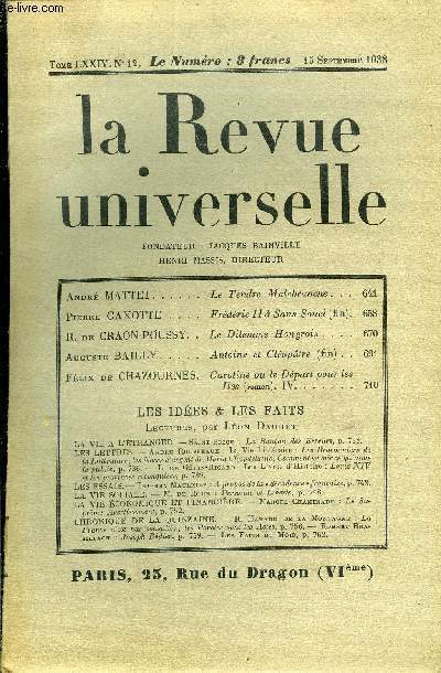 Sommaire : André MATTEI. Le Tendre Malebranche. Pierre GAXOTTE. Frédéric IIà Sans-Souci (fin).R. de CRAON-PÜUSSY. Le Dilemme Hongrois. Auguste BAILLY. Antoine et Cléopâtre (fin).Félix de CHAZOURNES. Caroline ou le Départ pour les Iles (roman). IV. LES IDÉES & LES FAITSLectures, par Léon DaudetLA VIE A L’ÉTRANGER. — Saint-Brice : La Rançon des Erreurs.LES LETTRES. — André Rousseaux : La Vie Littéraire : Les Braconniers de la Littérature; les Noces d'argent de Maria Chapdelaine; Comment savoir ce qu’aime le public. — L. de Gérin-Ricard : Les Livres d’Histoire : Louis XIV et les provinces reconquises.LES ESSAIS. — Thierry Maulnier : A propos de la « décadence » française.LA VIE SOCIALE. — M. de Roux : Personne et Liberté. LA VIE ÉCONOMIQUE ET FINANCIÈRE. — Marcel Chaminade : Le Suprême Avertissement.CHRONIQUE DE LA QUINZAINE. — R. Havard de la Montagne : La France n’est pas consultée; les Paroles sont les Actes. — Robert Brasillach : Joseph Bédier. — Les Faits du Mois. Classification Dewey : 70.49-Presse illustrée, magazines, revues