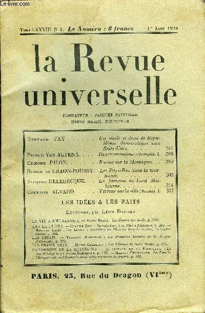 Sommaire : Bernard FAŸ. Un siècle et demi de République démocratique aux États-Unis. Pierre Van ALTENA. Ils se sont toujours trompés. I.Edmond PILON. Racine sur la Montagne. Roger de CRAON-POUSSY. Les Pays-Bas dans la tourmente. Jacques DELEBECQUE. La jeunesse de Lord Melbourne. Corrado ALVARO. Terreur sur la ville (Roman). I.LES IDÉES & LES FAITSLectures, par Léon DaudetLA VIE A L’ÉTRANGER. — Saint-Brice : La Guerre des nerfs.LES LETTRES. — Claude Roy : Introduction à la Poésie française. —-Robert Kemp : Les Livres : Introïbo; les Plaisirs dans le miroir; la Capricieuse.LES ESSAIS. — Thierry Maulnier : La Première histoire de la Guerre d'Espagne.LES BEAUX-ARTS. — Henri Charlier : Les Vitraux de Notre-Dame.CHRONIQUE DE LA QUINZAINE. — R. Havard de la Montagne. : Le Saint-Siège et « l'Action française ». — Marcel Chaminade : La Part de l’Empire colonial français dans notre économie de guerre. Classification Dewey : 70.49-Presse illustrée, magazines, revues